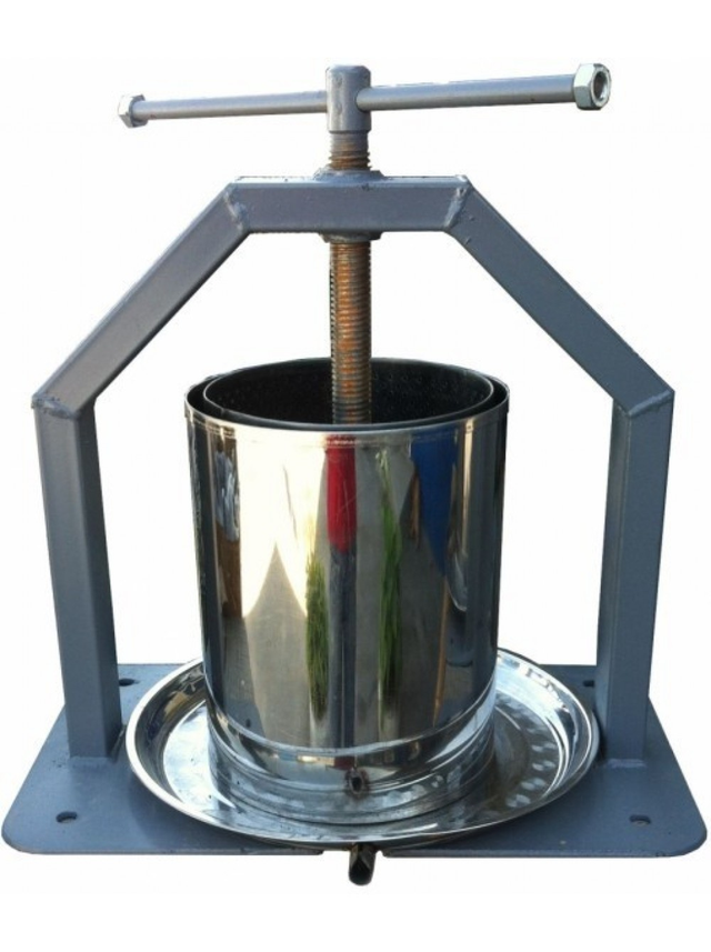 Даний агрегат є кошиком з нержавіючої сталі і металевий кожух з гальванічним покриттям і поршнем, що віджимає рідину. Поршень вкручується ручним способом шляхом обертання. Притискний диск щільно пристає до кошика, забезпечуючи якісние віджимання. Вся конструкція гвинтового преса встановлена на міцну раму, стійка та надійна. Видавлений сік або сироватка фільтруються через тканину і стікають у піддон. Пристрій дозволяє зібрати одну операцію до 20л рідини.